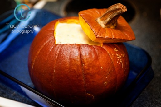 I was very excited about this soup because of the novelty factor, but I’m convinced that you couldn’t possibly make it work. To scrape enough flesh into the soup it is nearly impossible not to damage the structural integrity of the pumpkin shell. Also, the flesh that gets scraped from the inside comes out in chunks, making it mandatory that you run the soup through a food processor after you take it out of the oven. Scooping soup out of a super-soft pumpkin without causing it to collapse is not an easy task. I don’t know how you could actually make this soup work as planned, so, sadly, I don’t recommend it. But it was a fun experiment, and it made the house smell good :)