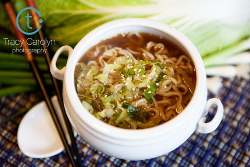Food in the Philippines was…interesting.  (I think you can infer what I mean by interesting.)  But one dish always brough comfort – a steaming bowl of brothy noodles.  We sampled Filipino versions of this dish, but frankly my favorites were the ones I had at the two Japanese restaurants John and I visited.  In an attempt to recreate this delicious dish while the flavor is still fresh on my tastebuds, I opted to make ramen soup this week.  The broth turned out quite tasty, and I suspect this dish outdoes any packet of ramen noodles you’ve ever had (I can’t say for sure though – never found a Top Ramen that was vegetarian :) )  Best served as lunch, eaten with both chopsticks and a soup spoon.  Enjoy!