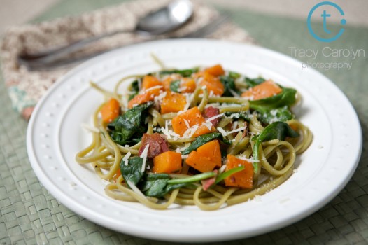 Set up a pot of salted water to boil. Begin to cook the pasta. While the water is heating, spray a large nonstick skillet with cooking spray and cook the bacon. Add the garlic and some black pepper. Add the cooked squash to the pan. Remove from heat and set aside.
